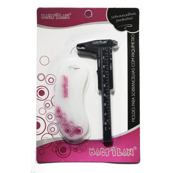 Moldes para sobrancelhas para design e preenchimento das sobrancelhas com praticidade. São seis moldes com desenhos vazados para você encontrar o formato ideal para cada rosto. O paquímetro ajuda a medir as sobrancelhas e garantir o desenho perfeito.